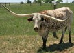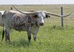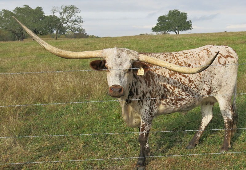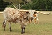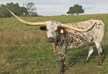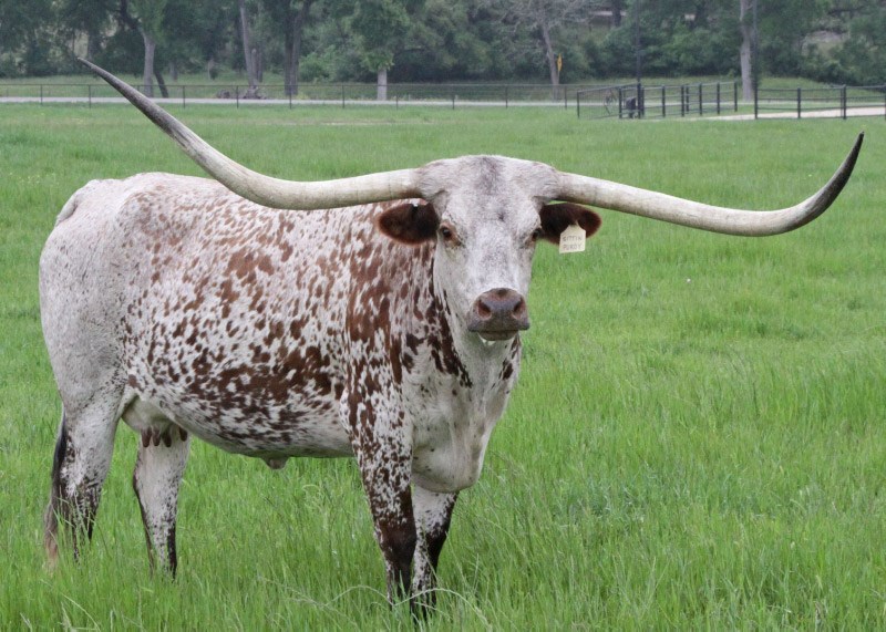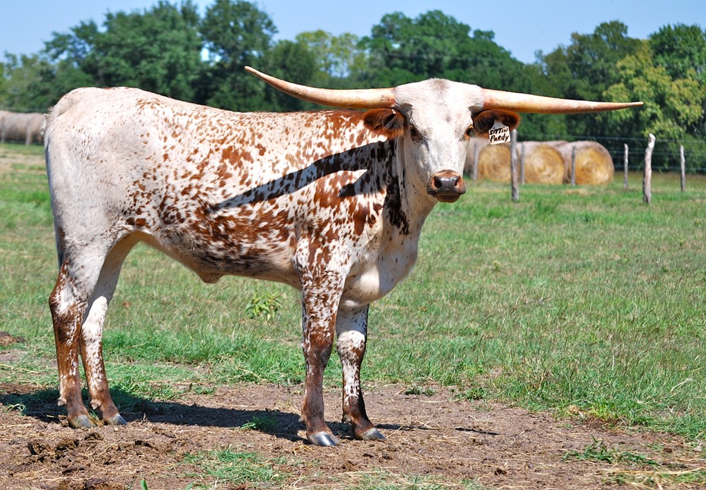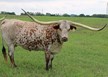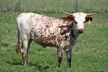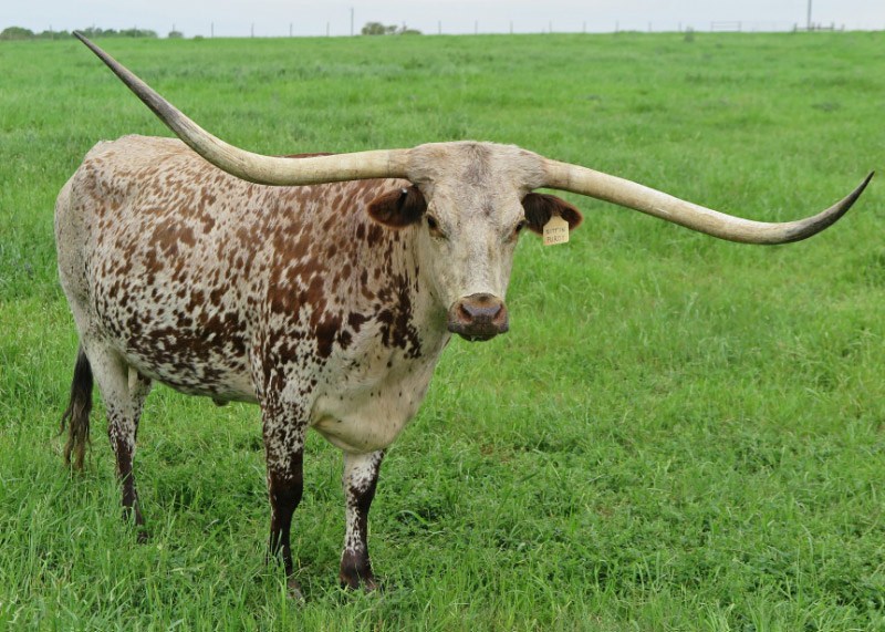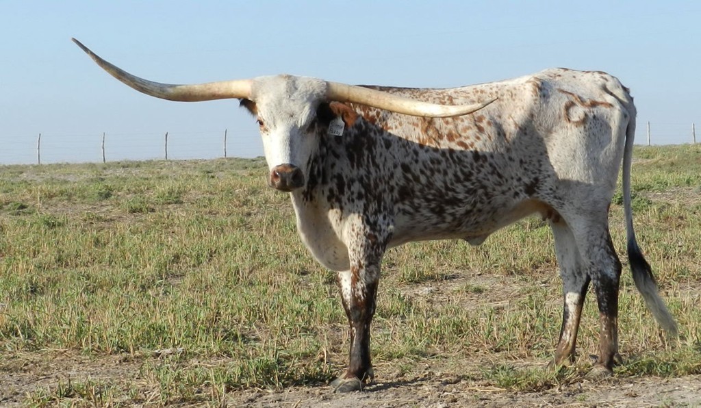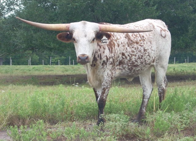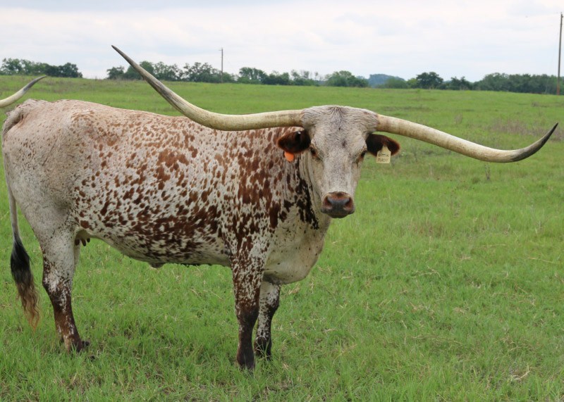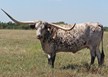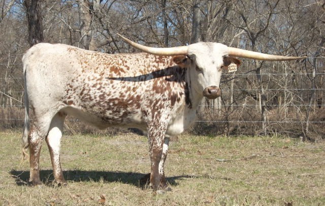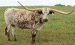 Super colorful young cow with asymmetrical horns. Will be over 200" composite horn and over 100" total horn. Wonderful personality and mother. Produces great calves. Triple bronze winner at the 2011 LWC. One of our best cows.