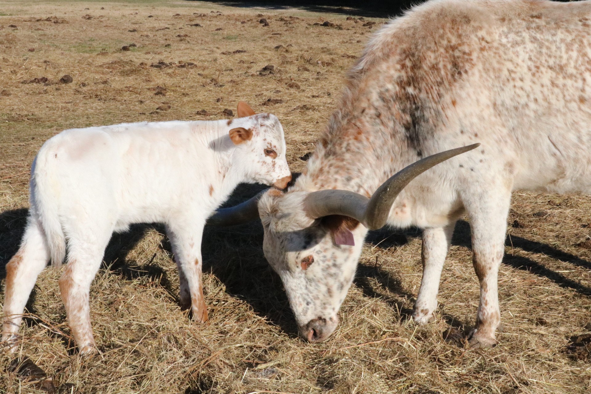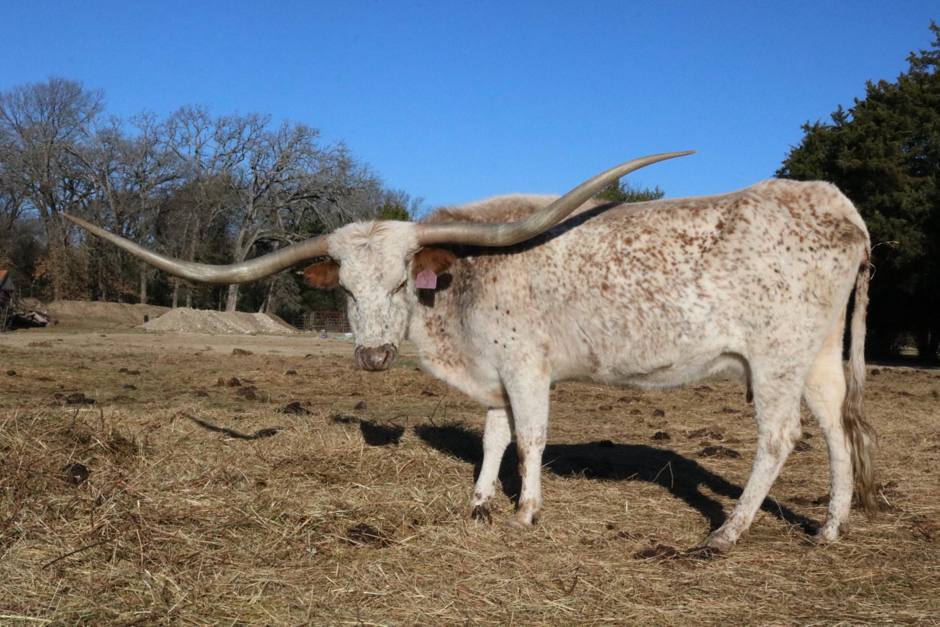Excellent young cow out of the 95" TTT blue roan bronze winning bull Patton HB. Unusual dapple gray roan and red roan coat. Proven producer whose first calf, a heifer, measured 79" ttt at only 3 yrs 3.5 months! Princess is tracking to be over 93” TTT at maturity! She's one of our foundation cows.